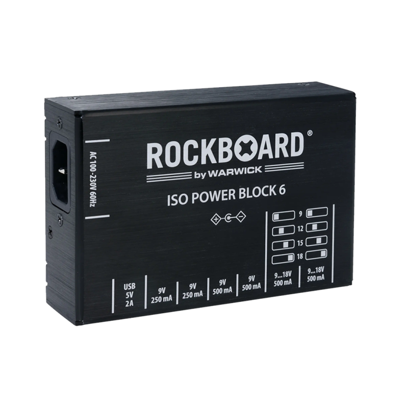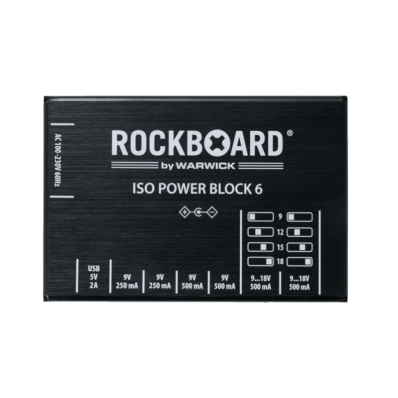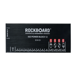 The ISO Power Blocks 6, 9 and 12 IEC are multi-power supplies for effect pedals and provide up to 12 electrically isolated, highly filtered power connections and a 5V USB connection. The multi-power supply is designed to provide noiseless power to up to 12 effects pedals simultaneously, even with different operating voltages.